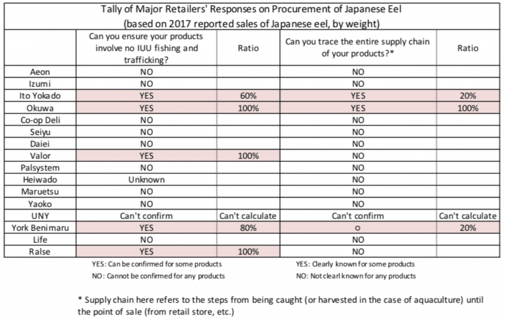The study shows that “for 11 of 16 companies that were selling Japanese eel (Aeon, Izumi, Co-op Deli, Seiyu, Daiei, Palsystem, Heiwado, Maruetsu, Yaoko, UNY, and Life) we learned that none of the products could be reliably verified not to involve IUU fishing or trafficking. None of the 11 companies were able to clarify the entire supply chain from fishing (when glass eels were caught) to sales in stores, and for all of them the reason was that it was impossible to trace the process from glass eels being caught to the point they are placed in an aquaculture pond.”